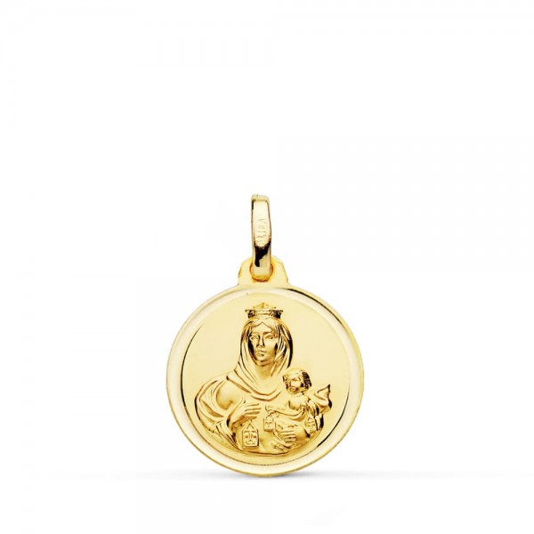 Medalla de la Virgen del Carmen, Nuestra Señora del Carmen, Santa María del Monte Carmelo, realizada en oro de primera ley de 18 quilates (750/ooo milésimas). Medalla religiosa redonda con la imagen en relieve de la Virgen del Carmen, con bisel exterior de estampación.
