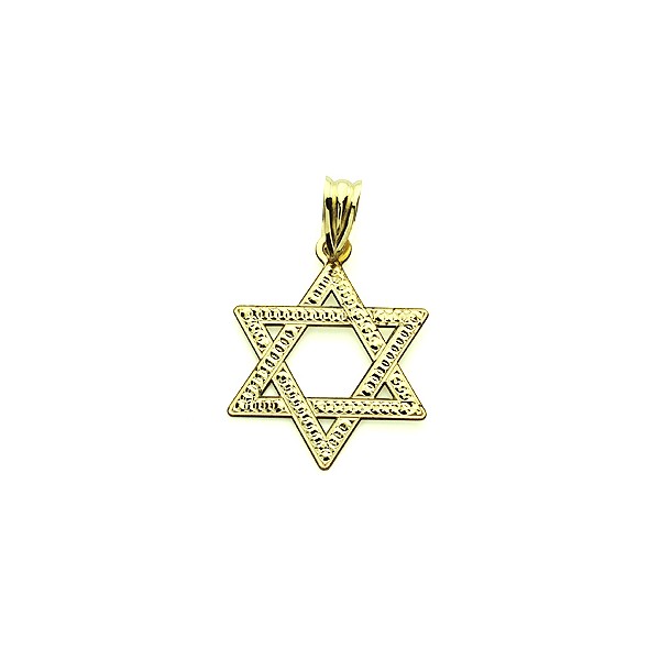 Colgante de la Estrella de David realizada en oro de primera ley de 18 quilates (750/oo milésimas). Estrella de David con adornos grabados.